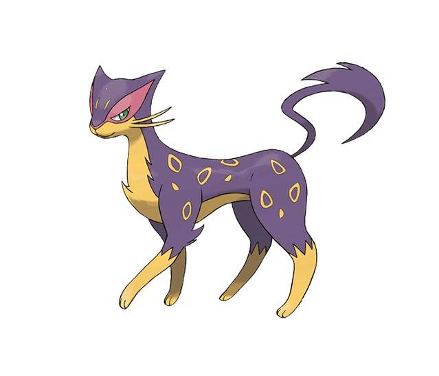 Son pelage demeure alors violet, mais se voit agrémenté de motifs jaunes, tandis que son corps s’agrandit pour lui permettre de gagner en agilité et en grâce. Quant à sa queue, elle s’allonge et se recourbe pour prendre la forme d’une faux, ce qui lui donne une allure menaçante.