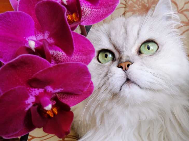 Pendant l'hiver, les fleurs ne sont pas légion... en tout cas en extérieur. En intérieur en revanche, il est possible de continuer à voir des plantes fleurir, y compris des plantes tropicales comme ces orchidées. Cela permet à ce chat à poil long de se sentir dans son élément, sans avoir besoin de sortir ni d'attendre la fonte des neiges.