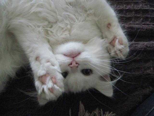 Petite minoune trouvée avec sa soeur Lilas par une connaissance près d'un chalet. Toute blanche avec 3 taches grises sur la tête.