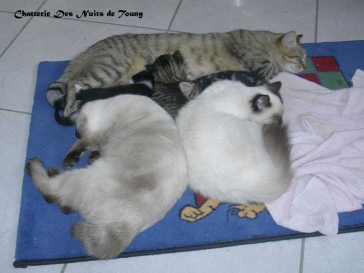 Photo de Maya, sa 1ère portée: Féline et Mynos, sa 2ème: Mythène, Chaussette et Buz