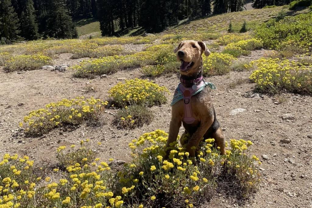 Un Airedale Terrier ayant la gueule ouverte et portant un harnais