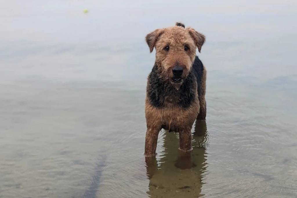 Un Airedale Terrier dans l'eau et regardant vers la caméra