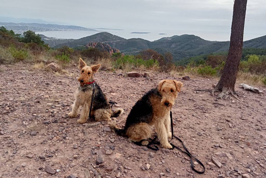 Deux Airedale Terrier assis sur une surface rocailleuse et qui sont tous deux tenus en laisse