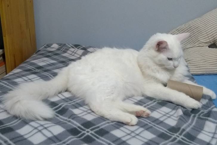 Un chiot Teckel mécontent qu'un chat Angora utilise son panier
