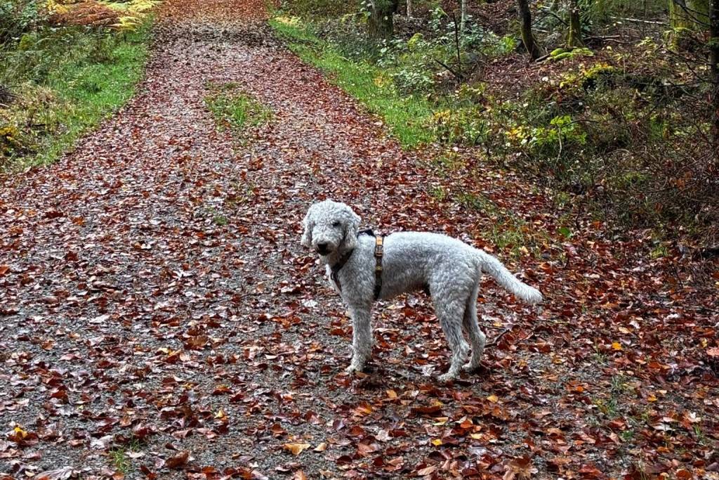 Un Bedlington Terrier sur un sol jonchés de feuilles mortes et portant un harnais