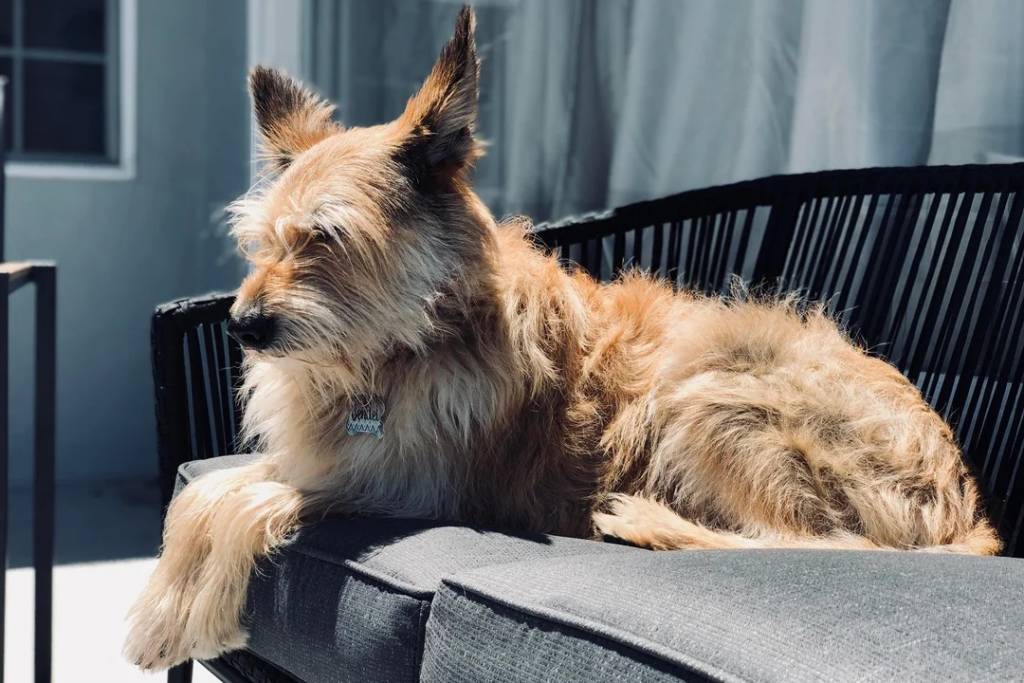 Un Berger Picard allongé sur un canapé et portant un collier autour du cou