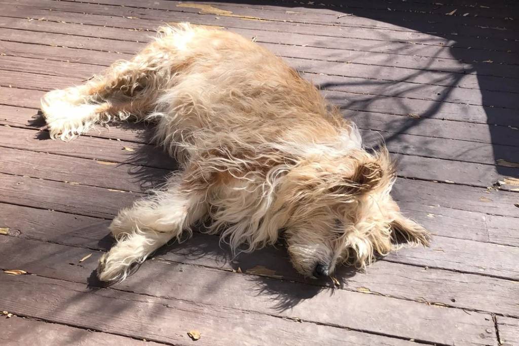 Un Berger Picard allongé sur un plancher et semblant détendu