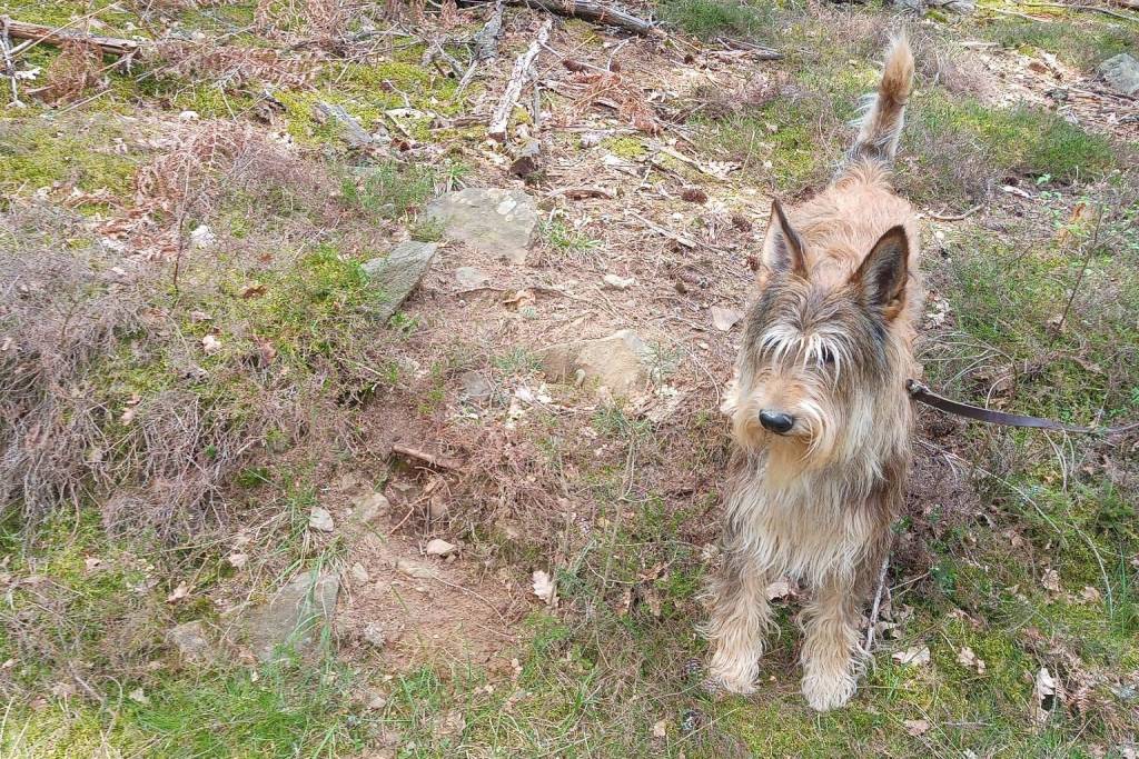 Un Berger Picard sur une surface herbacée et qui est tenu en laisse