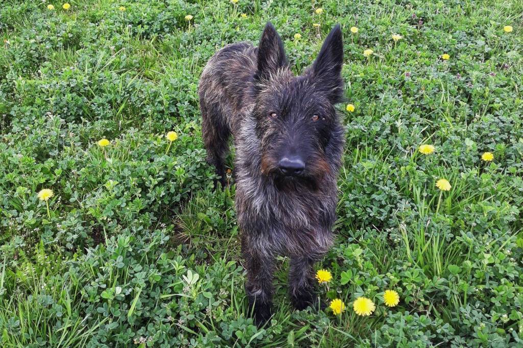 Un Berger Picard sur un terrain herbeux et regardant vers la caméra