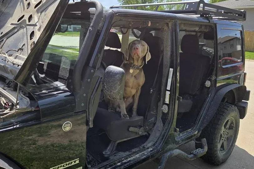 Un Braque de Weimar dans une voiture et portant un collier autour du cou