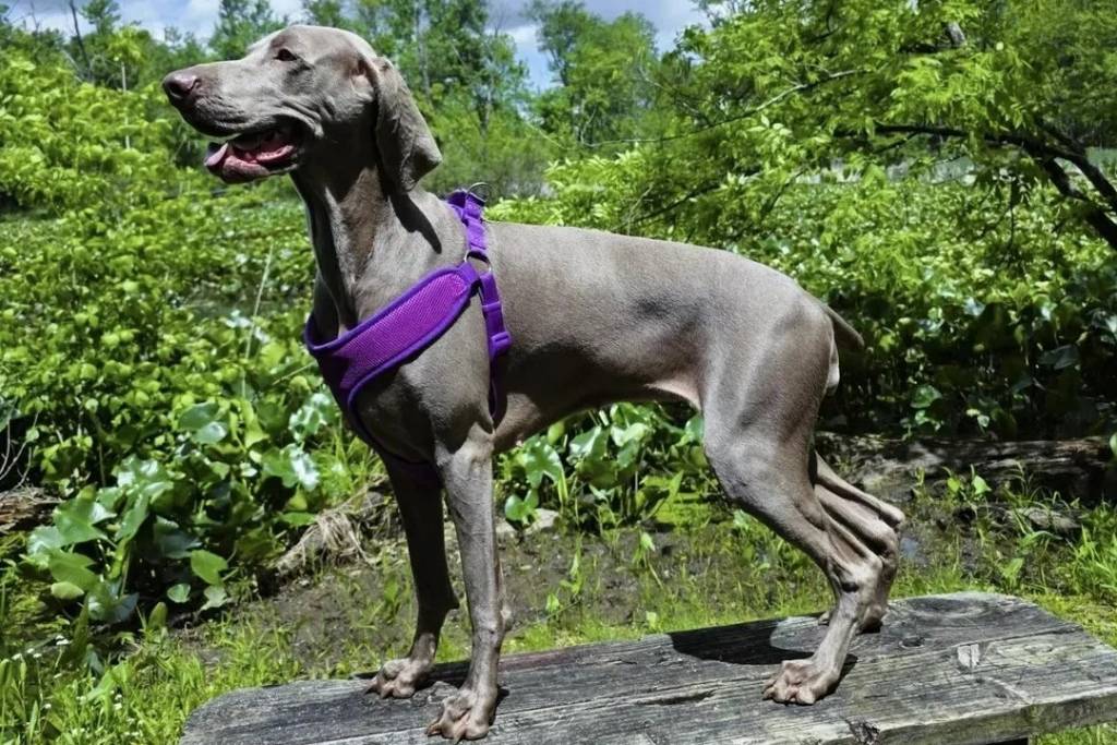 Un Braque de Weimar sur un banc en bois et portant un harnais