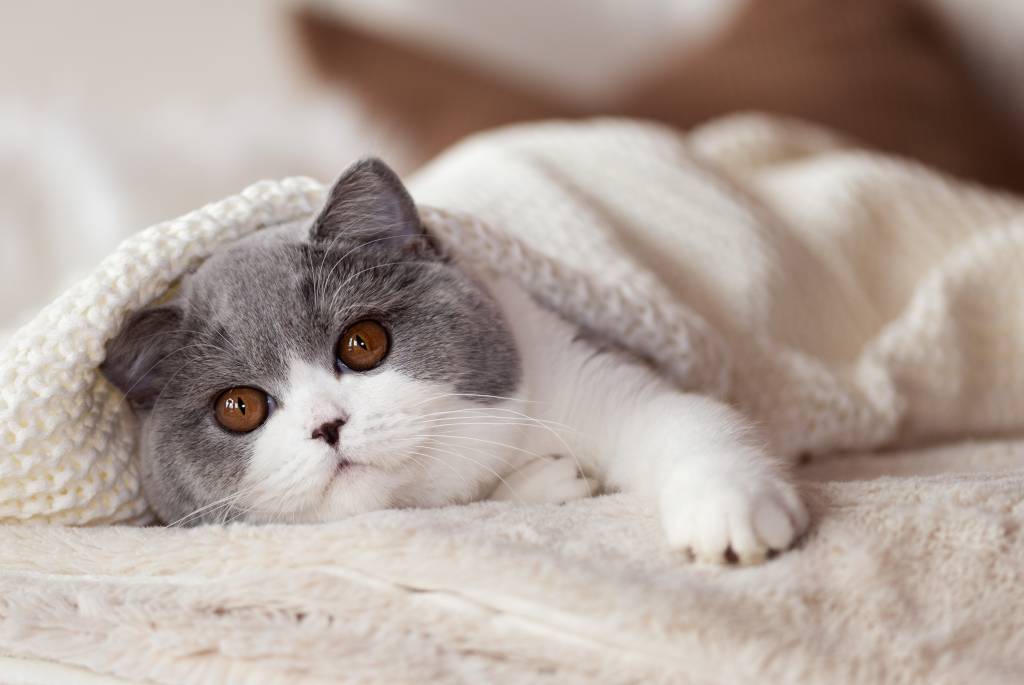 Un British Shorthair bicolore gris et blanc dans une couverture