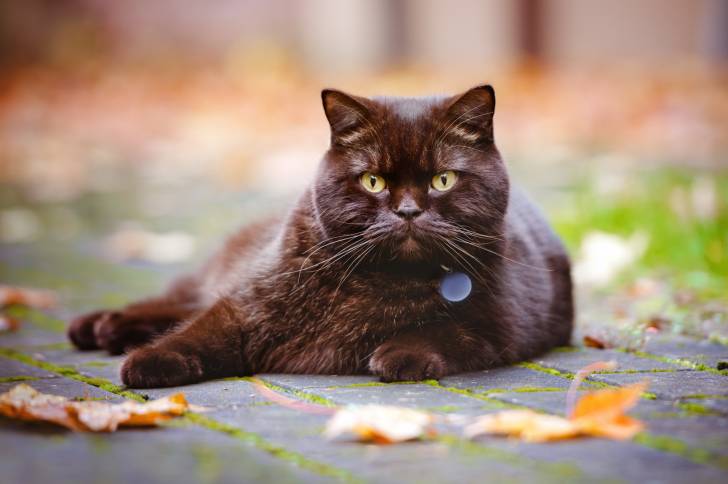 Un British Shorthair allongé sur une route