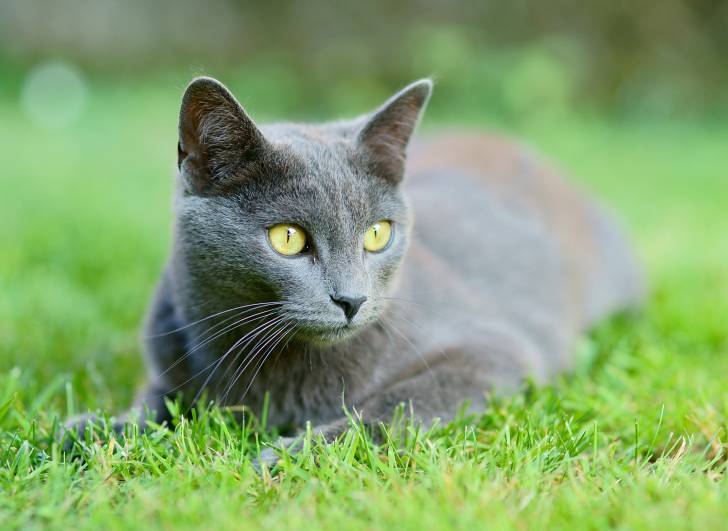 Un Chartreux aux yeux verts allongé dans l'herbe