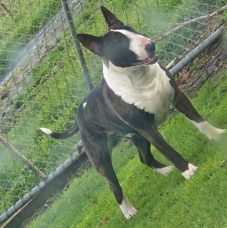 Un English Bulldog Terrier sur une surface gazonnée et semblant détendu