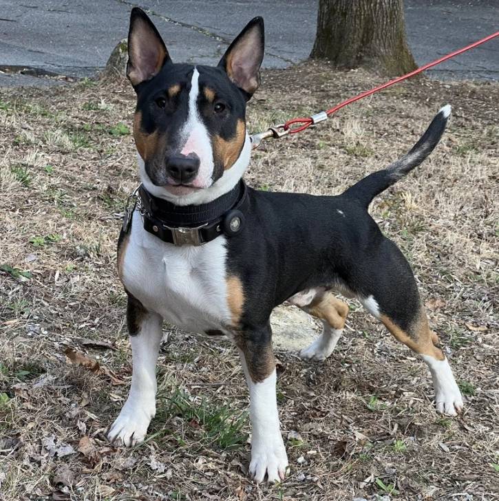 Un English Bulldog Terrier sur une surface bétonnée et qui est tenu en laisse