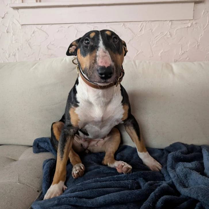 Un English Bulldog Terrier assis et portant un collier autour du cou