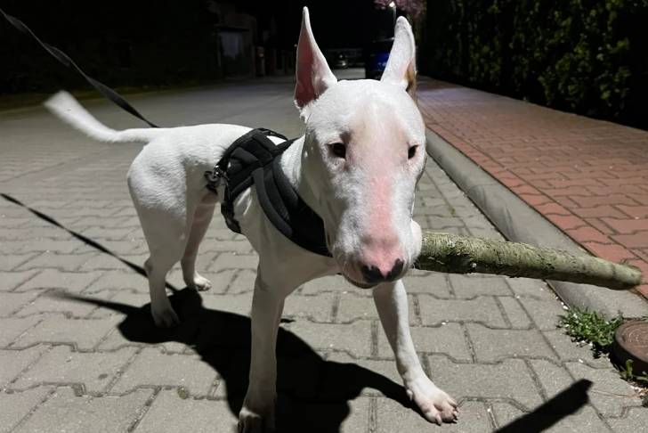 Un English Bulldog Terrier tenant un bâton dans sa gueule et qui est tenu en laisse