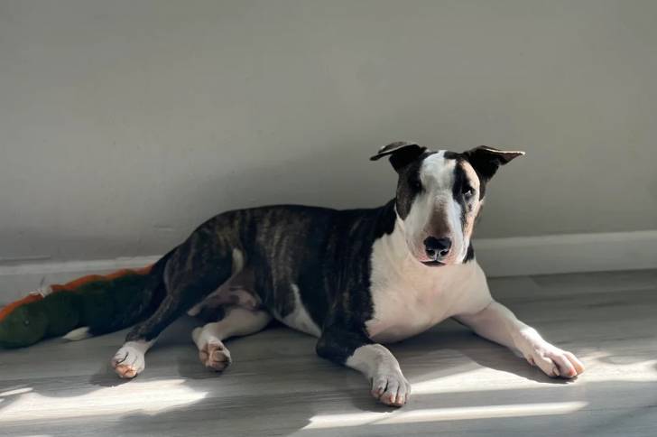 Un English Bulldog Terrier allongé sur un plancher et regardant vers la caméra