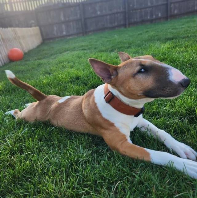 Un English Bulldog Terrier allongé sur une surface gazonnée et portant un collier autour du cou