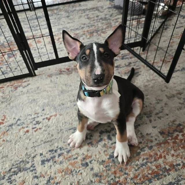 Un English Bulldog Terrier assis sur un tapis et portant un collier autour du cou
