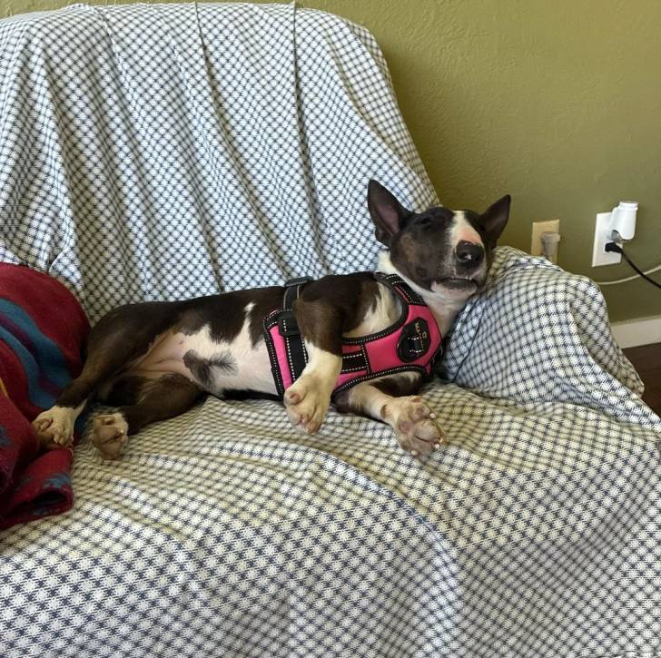 Un English Bulldog Terrier allongé sur un fauteuil et portant un harnais