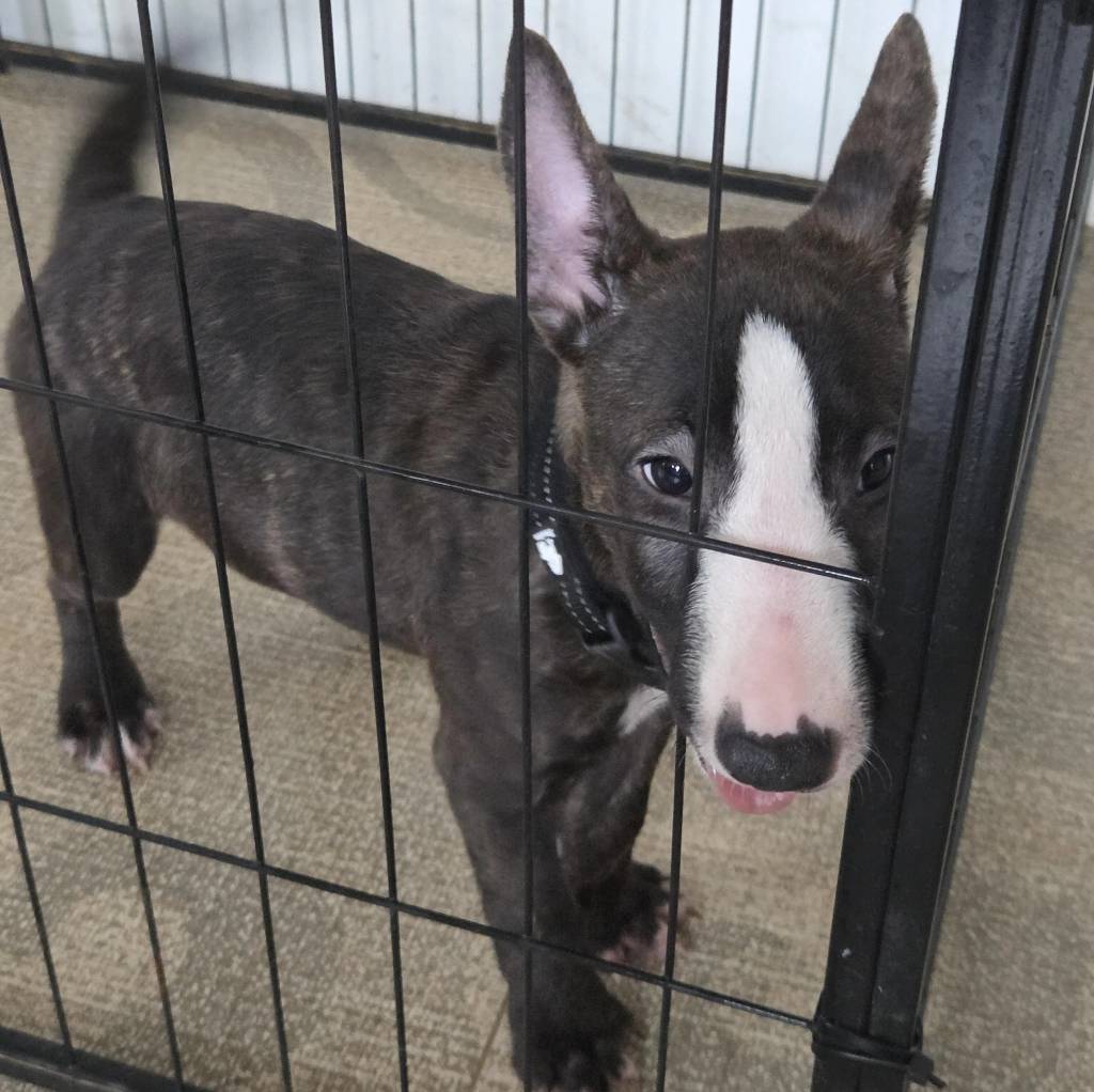 Un English Bulldog Terrier dans une cage et portant un collier autour du cou