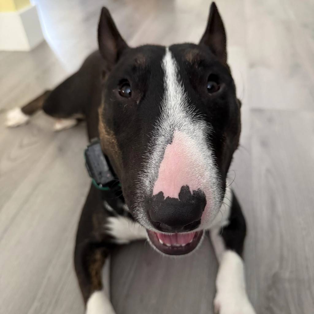 Un English Bulldog Terrier allongé sur un plancher et portant un collier autour du cou