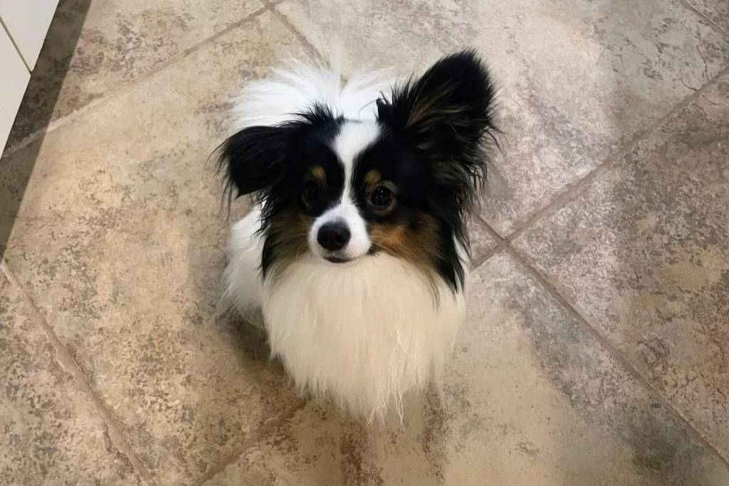 Un Épagneul Nain Continental Papillon assis sur un sol carrelé