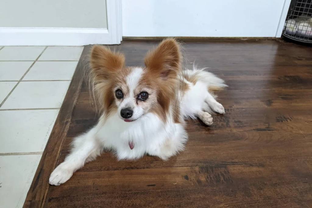 Un Épagneul Nain Continental Papillon allongé sur un plancher et portant un collier autour du cou