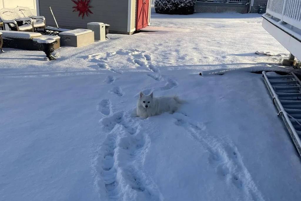 Un Esquimau Américain allongé sur une surface enneigée et semblant détendu