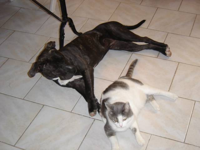 Luna, 4 ans en compagnie de Tanya, femelle amstaff de 8 mois. La chatte est la dominante