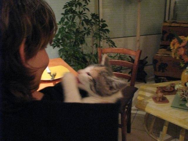 Désolée la photo n'est pas très nette, c'est juste la petite nouvelle de la famille: Plume, qui dort dans ma capuche de pull!