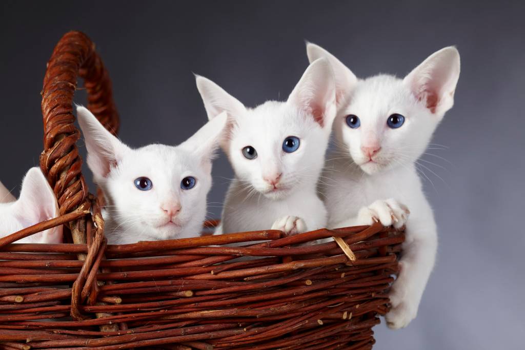 Un Foreign White et un Siamois s'amusent sur leur arbre à chat