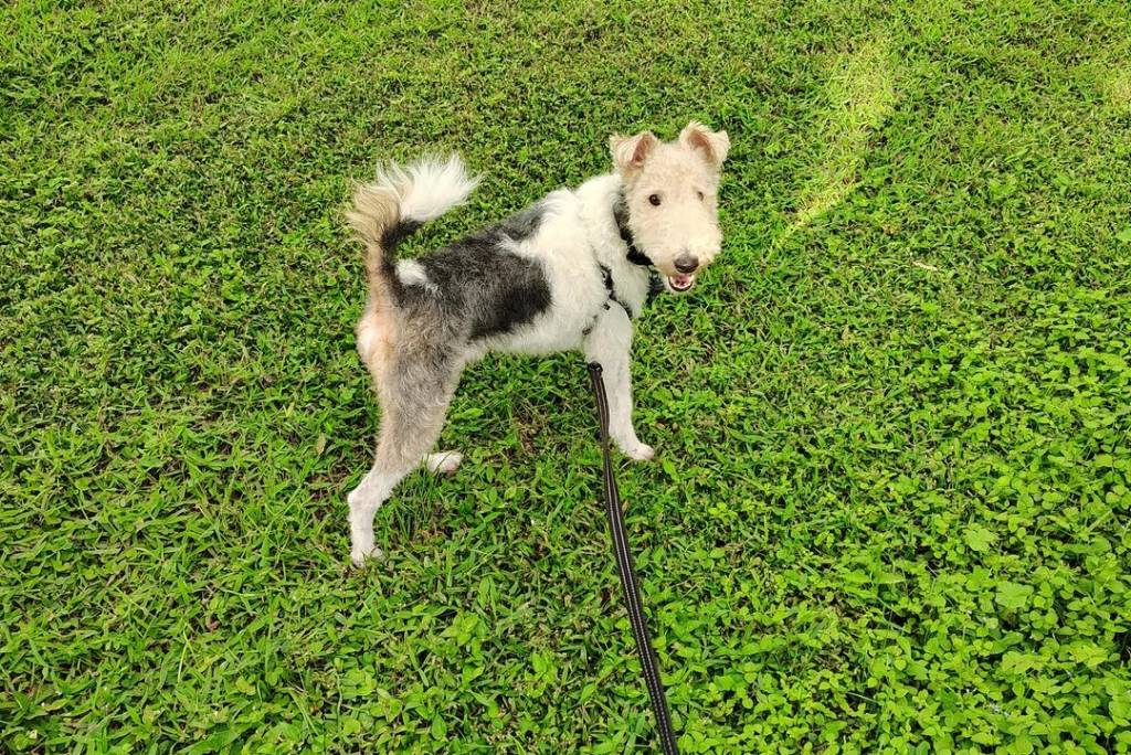 Un Fox Terrier à Poil Dur sur un terrain herbeux et qui est tenu en laisse