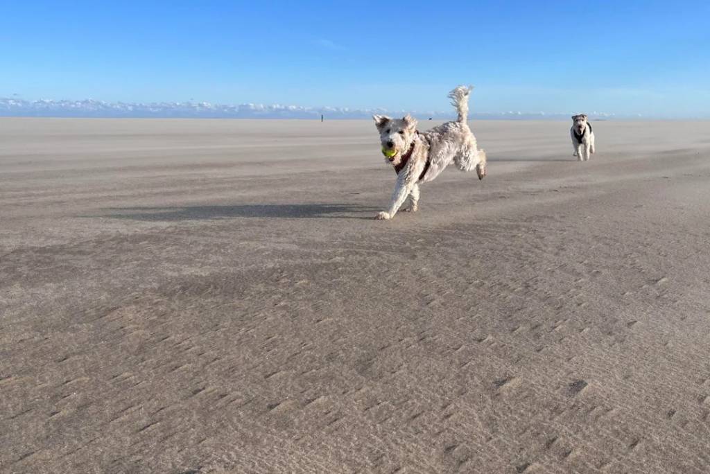Deux Fox Terrier à Poil Dur courant sur une surface sableuse et portant chacun un harnais