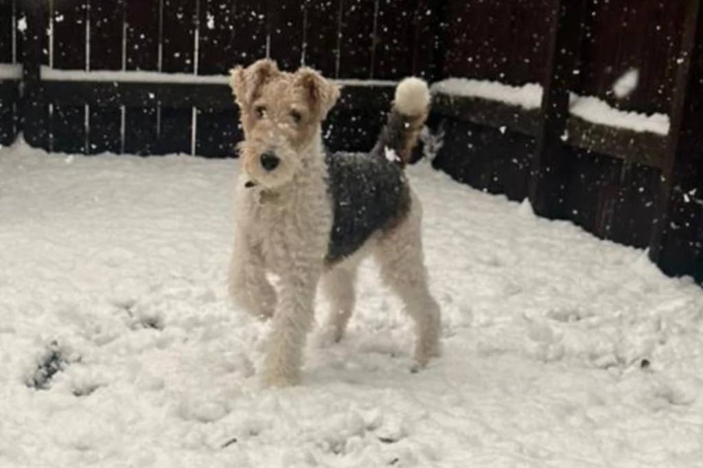 Un Fox Terrier à Poil Dur sur une surface enneigée