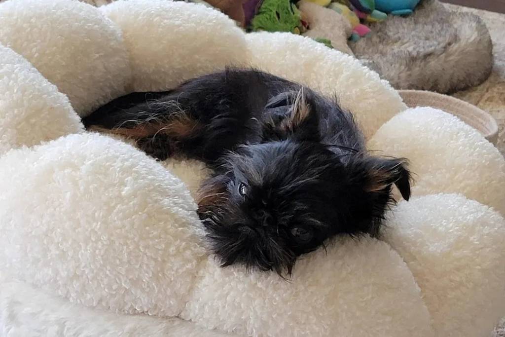 Un Griffon Bruxellois allongé dans un panier et semblant détendu