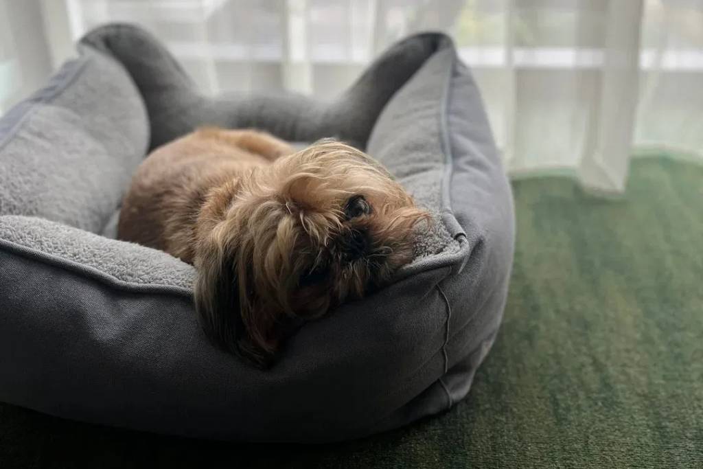 Un Griffon Bruxellois allongé dans un panier et semblant détendu