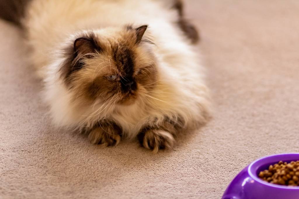 Un Himalayen allongé devant une gamelle de croquettes