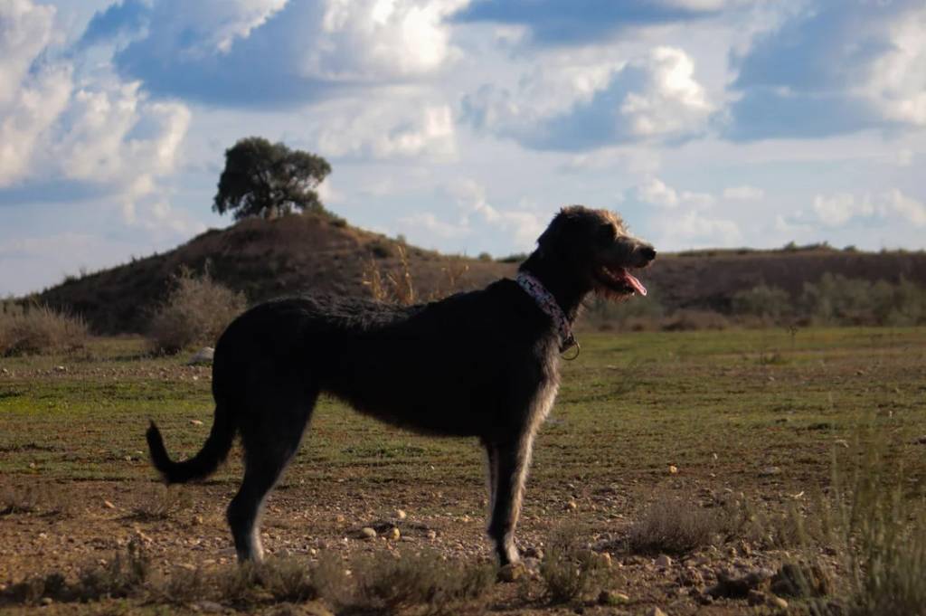 Un Irish Wolfhound sur une surface herbacée portant un collier autour du cou