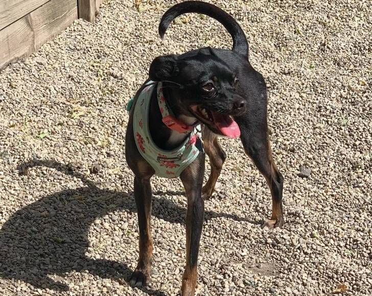 Un Italian Greyhuahua tirant la langue et portant un harnais
