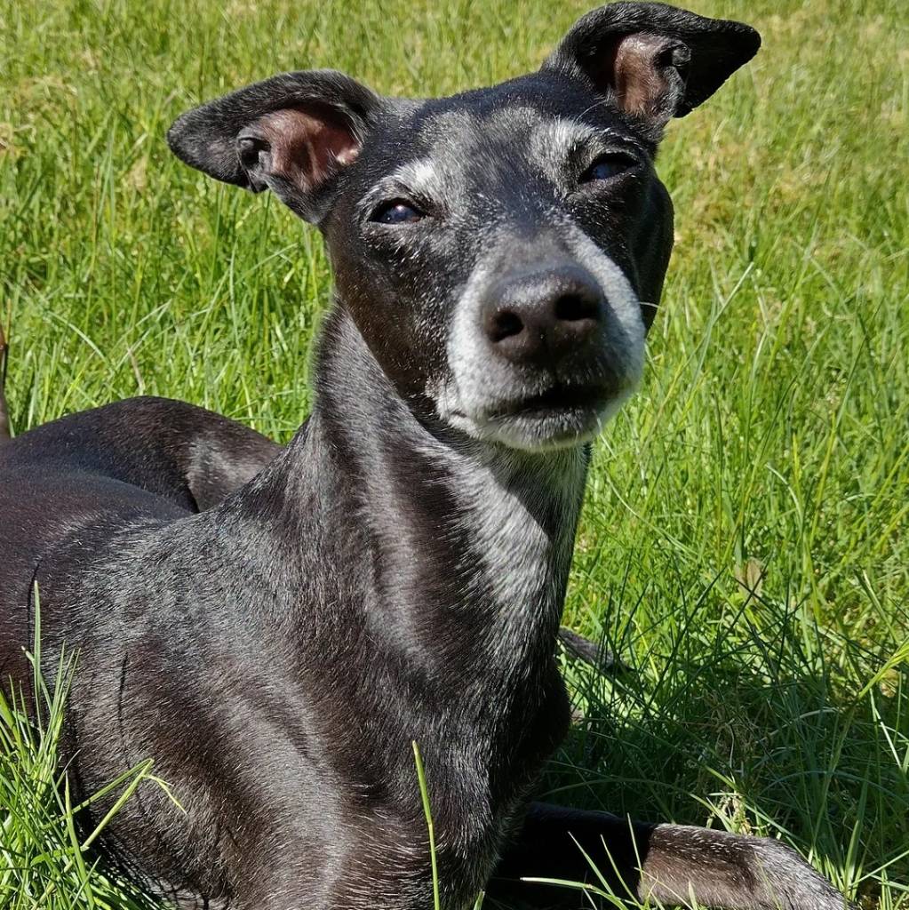 Un Italian Greyhuahua allongé sur une surface herbacée