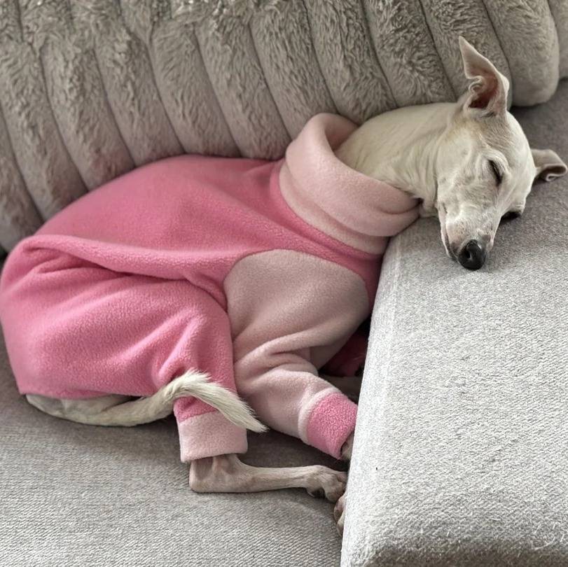 Un Italian Greyhuahua allongé sur un canapé et portant un habit pour chien