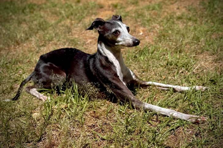 Un Italian Greyhuahua allongé sur un terrain herbeux