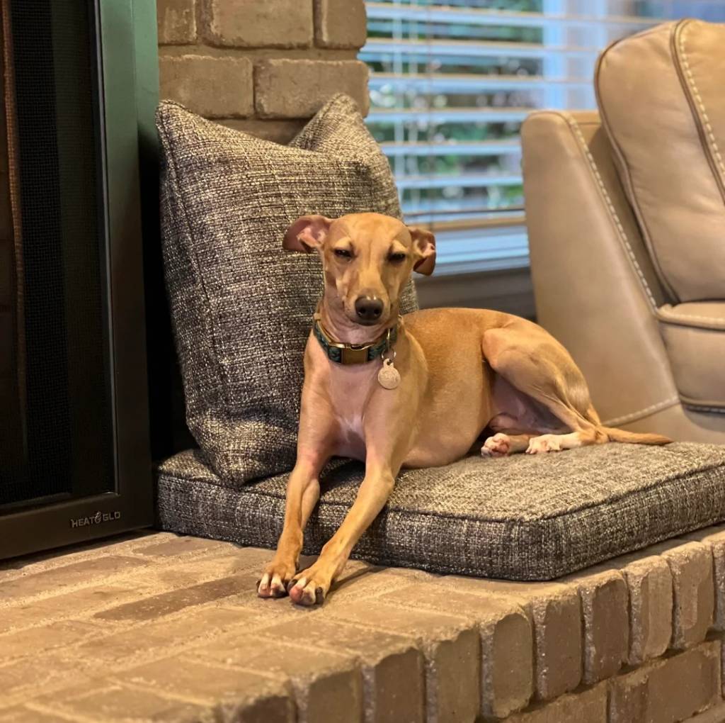 Un Italian Greyhuahua regardant vers la caméra et portant un collier autour du cou