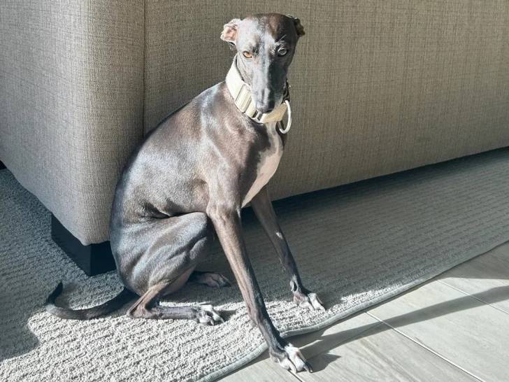 Un Italian Greyhuahua assis sur un tapis et portant un collier autour du cou