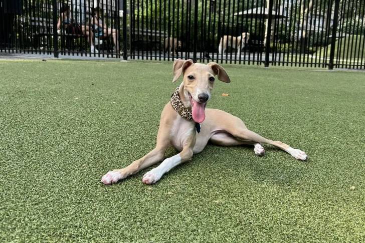 Un Italian Greyhuahua allongé sur une surface gazonnée et ayant la langue pendante