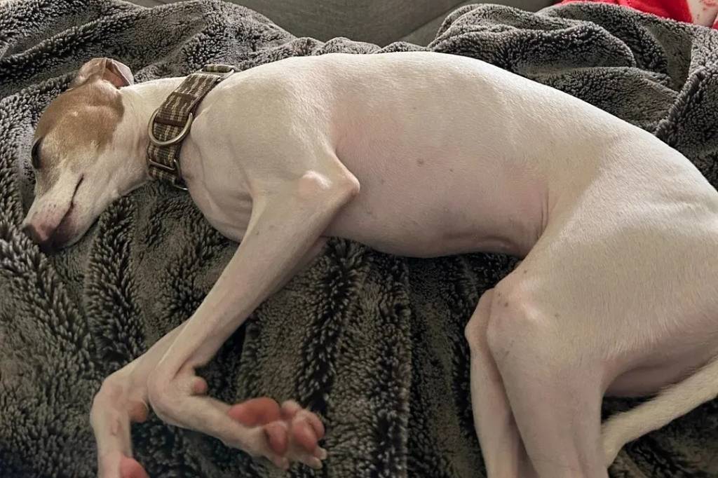 Un Italian Greyhuahua allongé et portant un collier autour du cou