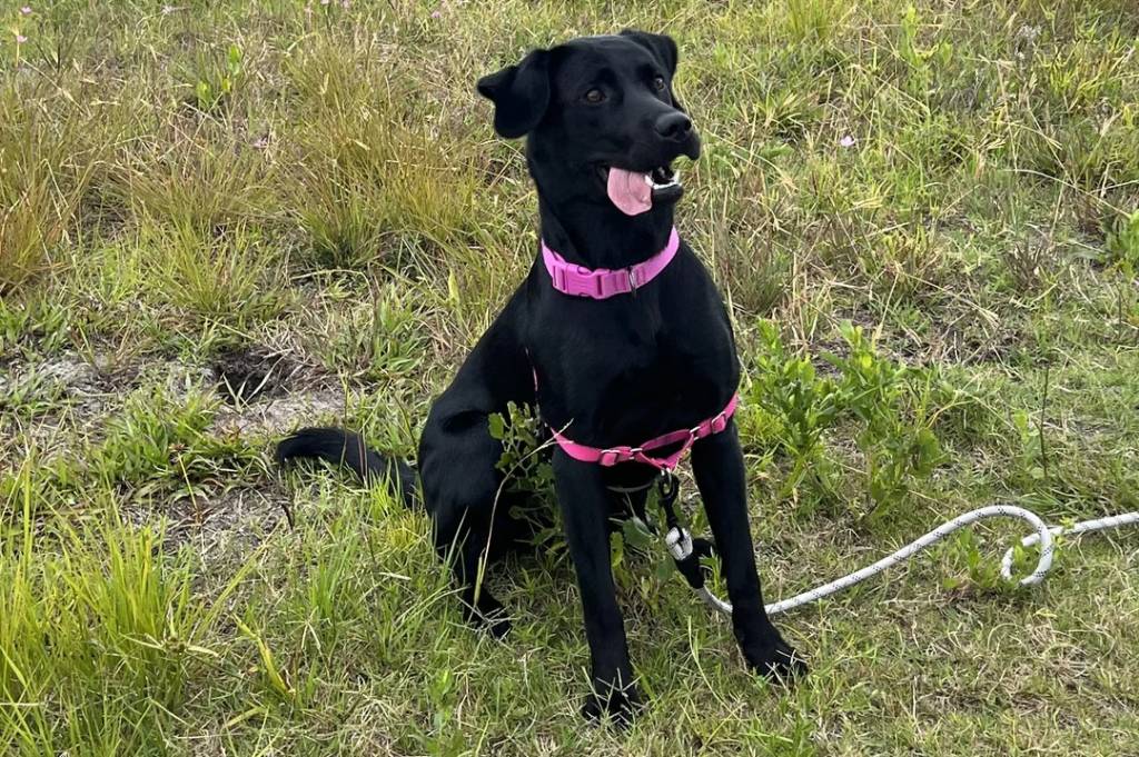 Un Labernois assis sur un terrain herbeux tirant la langue et tenu en laisse